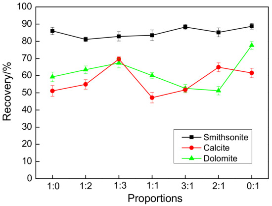 The effect of the combination of salicylhydroxamic acid and sodium oleate on the flotation of smithsonite, calcite, and dolomite was studied. When the total dosage of salicylhydroxamic acid and sodium oleate is 8 × 10−4 mol/L, different proportions of salicylhydroxamic acid and sodium oleate affect the flotation separation of smithsonite from calcite and dolomite, which was investigated at pH = 8.0; the test results are shown in Figure 7. It can be seen from Figure 7 that, under different proportions of salicylhydroxamic acid/sodium oleate combined collectors, the recovery of smithsonite is higher than that of calcite and dolomite. The combination of different proportions of salicylhydroxamic acid and sodium oleate has little effect on the recovery of smithsonite but has a large influence on calcite and dolomite.