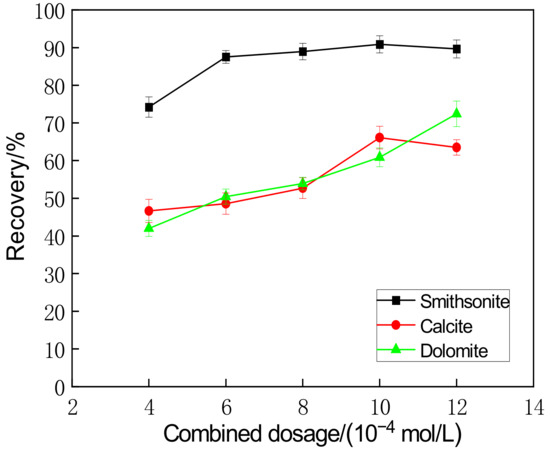 When the molar ratio of salicylhydroxamic acid/sodium oleate is selected as 3:1, the influence of the dosage of the combined collector on the flotation separation of smithsonite, calcite, and dolomite at pH = 8.0 is investigated, and the results are shown in Figure 8. It can be seen from Figure 8 that under the combination of different dosages of salicylhydroxamic acid and sodium oleate, the recovery of smithsonite is higher than that of calcite and dolomite. When the combined dosage exceeds 4 × 10−4 mol/L, the recovery of smithsonite tends to be flat. The recovery rate of calcite tends to be flat when the combined dosage exceeds 10 × 10−4 mol/L. The recovery rate of dolomite increases slowly with the increase in the combined-collector dosage.