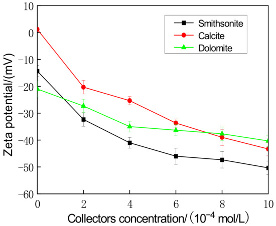 It can be known from Section 3.3 that salicylhydroxamic acid and sodium oleate have a good synergistic effect on the separation of smithsonite, calcite, and dolomite when used as combined collectors, so it is important to clarify the adsorption mechanism of combined collectors on the three mineral surfaces. Figure 10 shows the surface potentials of the three minerals at pH 8.0 with different concentrations of combined collectors (salicylhydroxamic acid/sodium oleate molar ratio of 3:1). It can be seen from Figure 10 that the potential of the surface of the three minerals is more negative after the combined collector acts, indicating that the combined collector also makes the surface of the three minerals have a different type of adsorption besides electrostatic adsorption. On the other hand, it can be seen that the surface potentials of smithsonite and carbonate gangue minerals are significantly different when the combined-collector concentration is above 6 × 10−4 mol/L, indicating that the addition of combined collectors has a significant effect on the flotation separation for smithsonite and these two carbonate gangues, which is also consistent with the actual single-mineral flotation results.