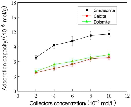 Figure 11 shows the adsorption capacity of the three minerals on the combined collectors when the pH value is 8.0 and different concentrations of the combined collector are added (the molar ratio of salicylhydroxamic acid/sodium oleate is 3:1). It can be seen from Figure 11 that, with the increase in the addition of the combined collector, the adsorption dosage on the mineral surface also gradually increases. However, the adsorption of combined collectors on the surface of smithsonite is stronger than that of dolomite and calcite. The higher the concentration added, the more obvious the difference, indicating that the combined collector is helpful for the flotation separation of smithsonite and carbonate gangues.
