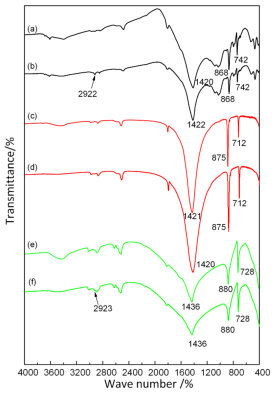 FTIR spectra of three minerals before and after treatment with the combined collectors. (a) smithsonite before, (b) smithsonite after, (c) calcite before, (d) calcite after, (e) dolomite before, and (f) dolomite after.