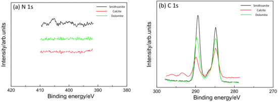 Figure 13a,b show the N 1s and C 1s spectra obtained in the XPS detection of the three minerals after treatment with the combined collectors. The difference in the adsorption of salicylhydroxamic acid on the mineral surface will be shown as the difference in the strength of the N element peak in the N 1s spectrum of the XPS test. As shown in Figure 13a, the absorption peak related to the N atom in salicylhydroxamic acid appears at 406 eV of the N 1s spectrum [39]. But by comparing the XPS spectra of the three minerals, there is no obvious difference in the intensity of the N 1s peak relative to the background. In addition, by comparing the three spectra in Figure 13b, it can be seen that there are two absorption peaks on the C 1s spectrum, among which the absorption peak at 284 eV is caused by sodium oleate in the combined collector and organic carbon in salicylhydroxamic acid, while the absorption peak at 289 eV corresponds to CO32− in the three mineral crystals [40,41]. After the treatment of the combined collectors, it can be observed that the 284 eV absorption peaks of C 1s on the surface of the three minerals have changed to varying degrees, among which the 284 eV absorption peak intensity of smithsonite (relative to the baseline) has the largest increase, indicating that the combined collector has the strongest adsorption on the surface of smithsonite. On the other hand, it can also be observed that the 284 eV absorption peak change intensity of C 1s on the dolomite surface after the treatment of the combined collector is higher than calcite. The combined results of N 1s and C 1s show that the order of adsorption strength of combined collectors on the surfaces of the three minerals is smithsonite > dolomite > calcite.