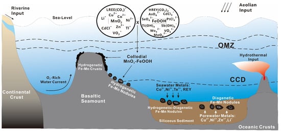 Schematic presentation showing the geneses, precipitation depths and locations of oceanic Fe-Mn crusts and nodules, electro-chemical model of sorption preferences on negatively charged Mn oxides and slightly positively charged Fe oxyhydroxides, OMZ: Oxygen Minimum Zone, CCD: Carbonate Compensation Depth. The graph is modified from [40].