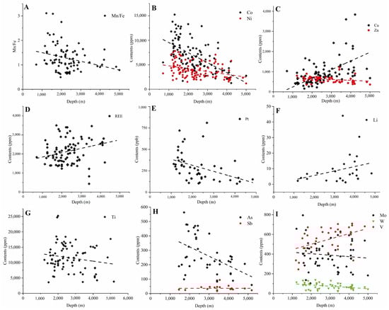 Critical metal abundance variations of hydrogenetic Fe-Mn crusts and nodules with seawater depths. The graph each shows the relation between water depth with (A) Mn/Fe, (B) Co and Ni, (C) Cu and Zn, (D) REE, (E) Pt, (F) Li, (G) Ti, (H) As and Sb, (I) Mo, W and V. Graphs and the trend lines are made and calculated from the data of [25,28,67,85,88,89,90,91,92].