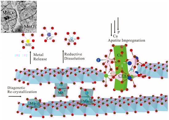 Schematic presentation of occurring processes in Fe-Mn crusts during phosphatization. Carbonate–fluorapatite (CFA) impregnation, lattice dissolution of Mn and critical metals, early diagenetic recrystallization. ME stands for metal. The red ball stands for oxygen. SEM image of CFA impregnation between hydrogenetic MnO2 cavity corresponding to this model is inset in the top left.
