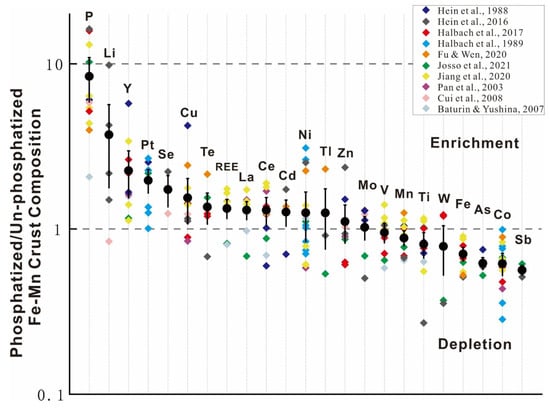 Alteration of the critical metals upon phosphatization. The black circle indicates average compositional changes, each diamond represents a phosphatized/un-phosphatized sample ratio, calculated from mean phosphatized Fe-Mn crusts normalized to the mean composition of un-phosphatized samples [4,72,85,90,92,93,99,101,102,104]. Varied colors represent applied data shown at the top right.