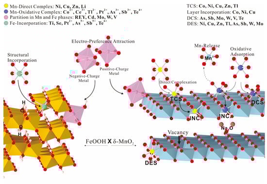 Five major enrichment pathways in Fe-Mn (oxy)hydroxides are concluded: (1) Ni, Cu, Zn and Li are enriched through direct complexations on the Mn oxides; (2) Co, Ce and Tl are enriched mainly through oxidation–substitution on the Mn oxides; (3) REY (except for Ce), Cd, Mo, W and V are partitioned between Fe and Mn (oxy)hydroxides through electro-attractiveness and overcoming repulsions; (4) seawater anionic Te, Pt, As and Sb show trends that their low-valence species are oxidatively enriched on δ-MnO2, in addition to the electro-driven adsorption onto FeOOH, while high-valence species are likely structurally incorporated in amorphous FeOOH to exhibit combined Mn-Fe phase enrichments; (5) Ti and Se show predominant sorption by amorphous FeOOH.