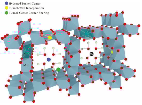 Schematic presentation of major metal coordination in diagenetic tunneled todorokite. Large-radius cations like Tl, Li, Cd, Mg, Ca and Na are prone to occupy tunnel center, Ni, Cu, Zn can occupy central position but also tend to occupy edge-sharing and corner-sharing positions in the tunnel and wall incorporation [36,105,119,147]. Colored configurations correspond to top-left legend.
