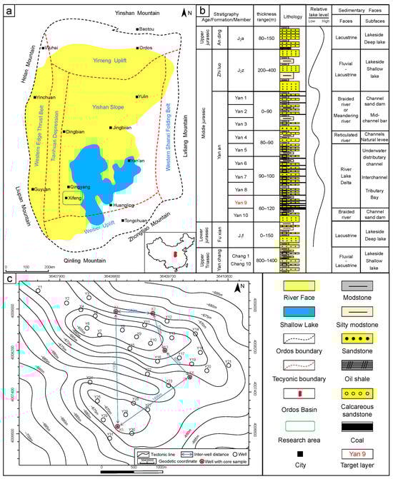 The Ordos Basin is a substantial oil- and gas-bearing basin in central China. It detached from the North China Plate in the Late Triassic and has evolved independently ever since. It is a multi-cycle cratonic basin [29] currently characterized by a gentle westward dipping monocline with a slope of less than 1° [30]. Based on the history of the basin’s structural evolution and its present structural features, the Ordos Basin is divided into six primary structural units (Figure 1a): the Yimeng Uplift, Western Edge Thrust Belt, Tianhuan Depression, Yishan Slope, Western Shanxi Folding Belt, and Weibei Uplift [31]. The Mesozoic oil resources in the Ordos Basin are vast, with the Jurassic Yan’an Formation being a primary exploration and development target for layers within the basin [32,33]. The Yan’an Formation is split into a total of 10 oil layer groups, labeled from bottom to top as Yan 10 to Yan 1 [34]. The Yan 10 oil layer group is a braided river sedimentary system, the Yan 9 to Yan 6 oil layer groups are river–lake delta sedimentary systems, the Yan 5 and Yan 4 oil layer groups have evolved into a network of a river–residual-lake sedimentary system, and the Yan 3 to Yan 1 oil layer groups are braided meandering river sedimentary systems [35] (Figure 1b).