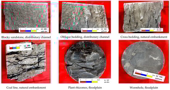 The sedimentary system of the YW oil reservoir falls within the meandering river delta plain. Different sedimentary facies are characterized by distinct hydrodynamic conditions and transportation methods, leading to spatial variations in the sandstone size, degree of sorting, and matrix content. These directly control the original porosity and permeability of the reservoir. However, in facies belts, such as alluvial fans, underwater fans, fan delta plains, and delta fronts, low-porosity and low-permeability reservoirs are usually developed. In these facies belts, the sorting of sediments is poor, the shale content is high, and the compaction is strong, forming low-porosity and low-permeability reservoirs at the early stage of diagenesis [38]. Moreover, the development horizon of the YW oil reservoir is the Y9 layer, which belongs to the coal measure strata. Core observation mainly reveals oblique and massive bedding with visible plant debris and coal lines (Figure 2). Typically, reservoirs located in or near coal measures are low-porosity and low-permeability reservoirs. Due to the gentle ancient terrain during the deposition of coal measure strata, the sorting and rounding of sedimentary particles are poor. The sedimentary environment of coal measure strata is enriched with aquatic and terrestrial plants. During deposition or early diagenesis, plants decompose quickly to produce humic acid, creating an acidic environment that hinders the formation of cement precipitated under alkaline conditions such as carbonate, sulfate, and silicate. Hence, in the early stage of diagenesis, there is a lack of cementation and filling of calcite, gypsum, and laumontite minerals, resulting in a lack of cement support between particles. Sediments are prone to compaction [39,40], leading to low porosity and permeability.
