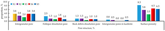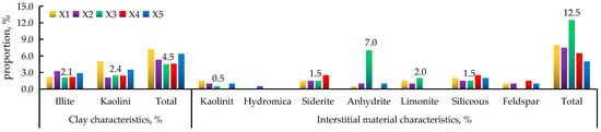 While the differences in mineral content and clay features among the five samples were not substantial, there were notable variations in the properties of the interstitial substances. Specifically, siderite and limonite barely regenerated once formed, resulting in a negligible effect on the modifications in the reservoir’s porosity. The secondary cementation of siliceous and feldspathic materials can lead to a decrease in reservoir porosity. Anhydrite, on the other hand, is highly susceptible to metasomatism and recrystallization [50], a critical diagenetic process that results in reduced reservoir porosity and permeability. The X3 sample contained the highest proportion of interstitial material, approximately 12.5%, primarily attributed to the high content of anhydrite (7.0%), leading to a drastic decrease in the surface porosity of the X3 sample (Figure 3 and Figure 4h,i). Due to the variance in the content and bonding methods of the interstitial materials, the reservoir exhibited significant micro-heterogeneity.