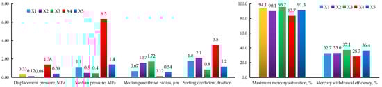 When comparing samples X1 and X5, the mercury injection and withdrawal curves were essentially identical, with negligible differences in the displacement pressure, median pressure, and pore throat radius. Nevertheless, the X5 sample had good sorting and high mercury withdrawal efficiency, suggesting weak pore heterogeneity and good pore throat connectivity.