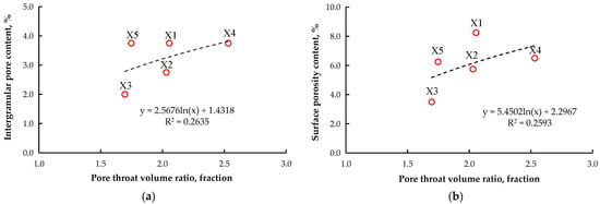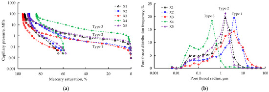 The smaller the pore throat volume ratio, the more developed the throat, the more favorable the migration of oil and gas, and the more easily the oil and gas in the pore can be displaced through the throat; on the contrary, a larger pore throat volume ratio is not conducive to the migration and enrichment of oil and gas and later mining. The pore throat volume ratio of the X3 sample was the smallest (Table 2), indicating that the throat was the most developed and the main oil and gas seepage channel. This finding can explain the reason why the X3 sample had low surface porosity, low permeability, and low displacement pressure.
