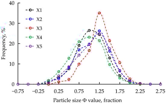 Particle size distribution characteristics can be analyzed using a frequency curve of particle size distribution. A single peak frequency curve with a narrow spread and high peak suggests good sorting and minimal micro-heterogeneity. Conversely, a wide spread and low peak indicate poor sorting and substantial micro-heterogeneity [52,53]. The bimodal frequency curve signifies mixed deposition, with poor to moderate sorting. If two peaks are close together and high, this suggests good sorting. However, wide peaks and a low peak suggest poor sorting. Based on the logarithmic normal distribution frequency curve of the particle size of the samples (Figure 10), all samples had a single peak. The X3 sample had the narrowest spread and the highest peak, suggesting minimal micro-heterogeneity. The X4 sample had the widest spread and the lowest peak, indicating maximum micro-heterogeneity. Standard particle size parameters, such as average particle size, standard deviation, skewness, and kurtosis, were evaluated for micro-heterogeneity [53,54]. According to Folk and Ward’s criteria [55,56], the X4 sample was an arenaceous medium-grained sandstone, but it had the lowest average particle size of only 1.12 mm. It also had the lowest kurtosis value, substantial skewness, and the highest micro-heterogeneity. The X2 sample had a medium particle size, maximum standard deviation, low kurtosis, high skewness, and significant micro-heterogeneity. The X3 sample had the largest average size, smallest standard deviation, highest kurtosis, and minimal micro-heterogeneity (Table 3). The heterogeneity of X2, X3, and X4 could be observed, with their respective rankings from highest to lowest being: X4, X2, and then X3. Upon comparing the samples of X1, X2, and X5, it was found that the X2 sample exhibited the greatest standard deviation and skewness, marking it as the most heterogeneous among the three. Despite the X5 sample having the largest mean particle size, its standard deviation and skewness surpassed those of the X1 sample. This indicated a diverse composition in the size and particle distribution of the X5 sample, resulting in a low sorting coefficient. Consequently, the heterogeneity of the X5 sample was more pronounced than that of the X1 sample. Evaluating the parameters of particle heterogeneity enabled the samples’ micro-heterogeneity to be ranked from highest to lowest as follows: X4 > X2 > X5 > X1 > X3.
