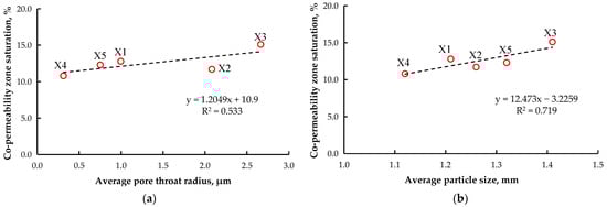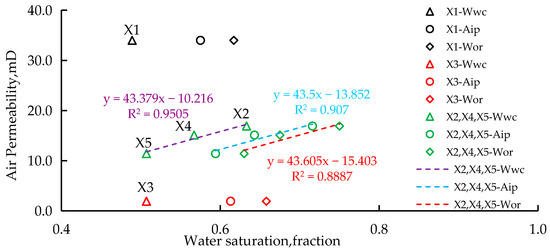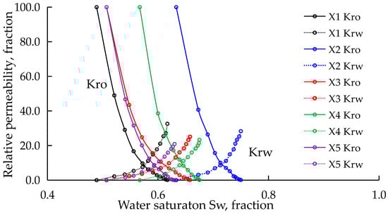 The X1 sample exhibited the highest permeability, with the lowest water saturation of 48.9%, which includes the proportion of irreducible water, and it also had the highest water phase permeability in the presence of residual oil. Among all the samples, the X2 sample had the highest saturation of irreducible water, reaching 63.3%. At the isotonic point, the water saturation peaked at 71.6%. The residual oil with the highest water saturation was at 75.0%. Although the permeability of sample X3 was the lowest at only 1.91 mD, it had the widest range of oil–water co-permeability (Table 4).