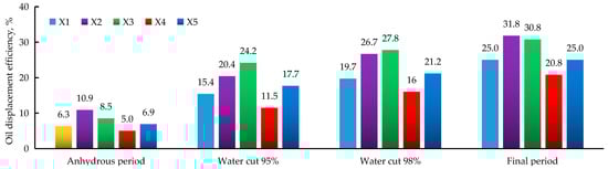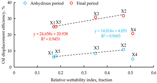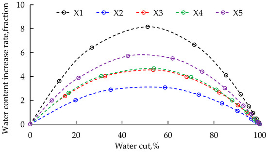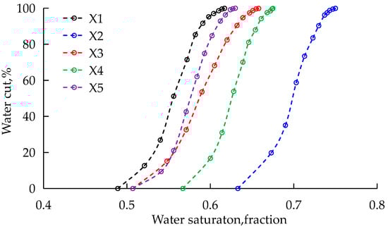 The correlation between the rate of the water cut increase and irreducible water saturation was evident (Figure 21, Formula 2). As irreducible water saturation rose, the rate of the water cut increase tended to decrease. Notably, samples X3 and X5 had an identical irreducible water saturation at 50.7%, yet their water cut increase rates varied. This discrepancy, as per Formula 1, can be attributed to the variable ‘b’. Despite being sourced from the same oil reservoir, with identical basic properties such as viscosity and temperature, these samples exhibited different pore structures. These variations indicated micro-heterogeneity, thus suggesting that the primary determinants of the water cut increase rate are irreducible water saturation and micro-heterogeneity. In scenarios where irreducible water saturation varies, it becomes the critical factor for the water cut increase rate. However, if the irreducible water saturation remains constant, the role of micro-heterogeneity diminishes, impacting the water cut increase rate inversely. Samples X3 and X4, despite having different irreducible water saturation, displayed essentially similar water cut increase patterns. This implies that the reservoir’s micro-heterogeneity governs the water cut increase rate for samples X3 and X4.