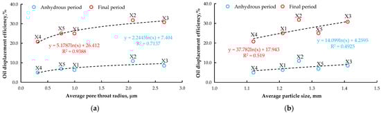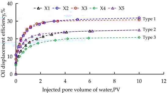The water-driving oil experiment was carried out with the same steps for water-driving oil used in the relative permeability experiment. The displacement pressure at the inlet end, displacement time, and oil production and water production at the outlet end were recorded during the displacement process. Throughout the water-driving oil process, the pore volume multiples of the initial simulated water droplet falling into the measuring cylinder were noted, and the anhydrous recovery rate was calculated. Data corresponding to different pore volume multiples were recorded until no oil was detected at the exit, signifying the termination of the experiment. The oil displacement efficiency at 95%, 98%, and 100% water cuts was calculated so as to obtain the relationship between oil displacement efficiency and the injection pore volume multiples.