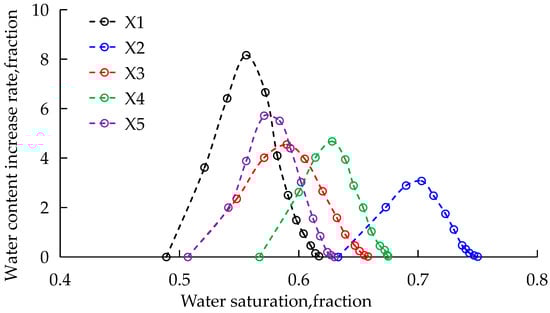 The correlation graph between the water cut increase rate and the water cut (Figure 20) highlights substantial variations in the water cut increase across different reservoirs within the same oil field. The X1 sample exhibited the greatest water cut increase rate, whereas the X2 sample showed the lowest. Although the X3 and X4 samples demonstrated distinct micro-heterogeneity, they followed a nearly identical pattern in terms of the water cut increase rate. However, the connection between the rate of the water cut increase and micro-heterogeneity remained ambiguous. By studying the relationship between the water cut increase rate and the water cut, we could provide further clarity on the connection with micro-heterogeneity. Using the permeability curve, we could derive a mathematical model, shown as Formula 2, that characterizes the relationship between the water cut and its increase rate.