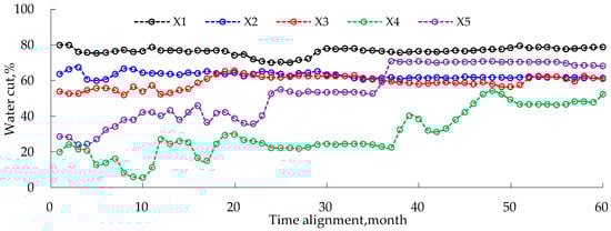 The commencement dates for oil wells tended to be inconsistent when comparing and analyzing the production performance of different samples corresponding to different oil wells through time alignment (Figure 22). For example, well X1 exhibited the highest water cut during the initial production phase. Although it maintained high water cut production, it also showed the highest increase rate. As water injection development progresses, the water cut is expected to rise sharply in the later stages. After 60 months of operation, wells X2 and X3 displayed a stable water cut, hovering around 60%. This stability can be attributed to high irreducible water saturation, weak micro-heterogeneity, favorable well physical properties, and a low water cut increase rate. Additionally, well X2 exhibited the longest period of anhydrous oil recovery. Well X3, displaying the weakest micro-heterogeneity, was the most conducive to achieving piston-type uniform displacement, resulting in a relatively low water cut increase. Despite occasional fluctuations during development, the water cut remained generally stable. The water cut patterns of wells X4 and X5 were basically consistent, beginning with a low water cut in the initial production phase. Owing to micro-heterogeneity impacts, the water cut varied with water injection development until high permeability channels formed, causing the water cut to surge or ascend in a stepwise fashion. Analyzing the production performance revealed that, in a standard water injection development process, if the production wells under study belonged to the same reservoir, were not affected by geological variables such as faults and cracks, and had similar initial transformation scales without subsequent transformation measures, the micro-heterogeneity of the reservoir directly influenced the water cut change in the production wells.