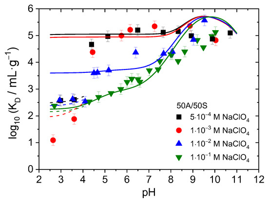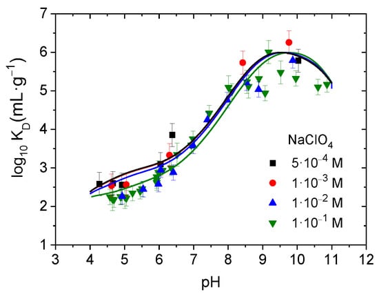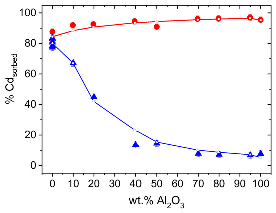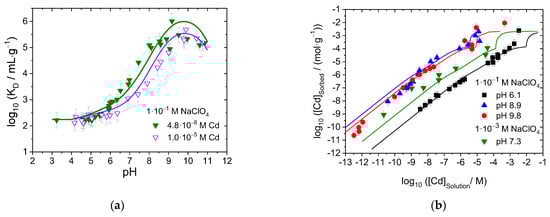 Cd sorption experiments were prepared in 12 mL polypropylene centrifuge tubes, with a total suspension volume of 10 mL. The effect of several variables (ionic strength, chloride concentration, Cd concentration, and sorbent) on Cd removal was analyzed. In general, Cd sorption experiments were prepared by the following procedure. A sorbent suspension was added (0.5 g/L final solid to liquid ratio at given NaClO4 concentration) to the centrifuge tube, followed by the addition of aliquots of buffers (2·10−3 M final concentration, as described in [40]) and Cd(II) stock solutions; then, the pH was adjusted if needed. After the required contact time of circular shaking, the Cd-containing suspensions were centrifuged at 21,500× g for 60 min. The supernatant was analyzed for Cd concentration (see Section 2.2.1) and pH.