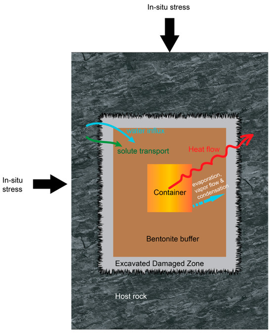 The host rock is mainly saturated, whereas the buffer is only partially saturated in the early stages, causing pore water to move from areas of higher pore pressure to lower pressure (blue arrow). Before heating, pore water flows from the nearby rock towards the EBS. However, during heating, the pore pressure near the periphery of the EBS increases due to the thermal expansion coefficient of water which is about one order of magnitude higher than the one of the solid skeletons. Because of the low permeability of the medium (for instance, at the South Bruce site in Ontario, a potential location for a DGR for spent fuel in Canada, the potential host formation has a permeability of the order of 10−21 m2 [14]), pore water movement is restricted, resulting in a buildup of pore pressure during the initial stages, which induces a temporary outward flow from the EBS. During the later stages, as the thermally induced pore pressure subsides, water migrates gradually from the heat source, allowing the pore pressure to dissipate.