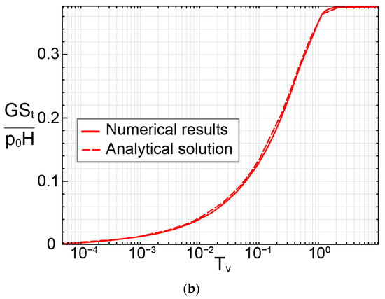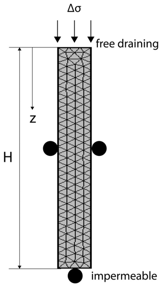 The Terzaghi 1D consolidation problem has been extensively used as a benchmark for the verification of numerical codes relating to poroelasticity ([26,27,28]). Its main utility is to test the accuracy of the solid–fluid coupling that relates fluid pressure to solid deformation and vice versa. The problem considers a saturated soil column of thickness H with an impermeable and fixed base, a free-draining and free-moving surface and laterally confined and impermeable vertical sides. The column is instantaneously compressed from its upper boundary by a constant uniaxial load ∆σ. This creates a sudden increase in pore pressure in the column which then dissipates by flow through the upper boundary. No temperature and solute transport are relevant for this situation and the soil column is saturated. Only governing Equations (2) and (5) are applicable in this situation, and with the assumption of linear elasticity of the solid skeleton, they are reduced to a one-dimensional coupled HM problem: