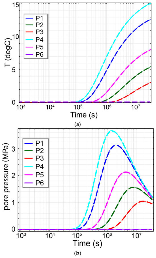 Furthermore, the reasoning behind the reduction in concentration when heat transfer is taken into account can be explained by the boundary conditions established in our model. Specifically, due to the presence of open drain boundaries on both the left and right sides of the model (depicted in Figure 13c), fluid movement is permitted in both directions. This implies that the nuclide can be transported either toward the right boundary or backward to the source. Figure 16a,b present the development of pressure and the Darcy velocity field relative to the radial distance from BH1. As indicated by Figure 16b, the velocity field exhibits negative values in close proximity to the borehole wall, signifying backward flow, with absolute magnitudes relatively higher than those of the forward flow (positive velocity). Similarly, Figure 16a reveals a steeper pressure gradient closer to the left boundary. These observations highlight the intensity of the backward flow, causing the lower concentration in case C2 in comparison to case C1.