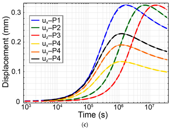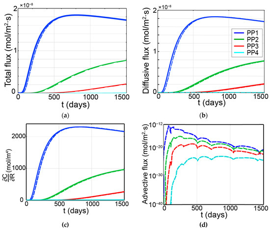 The total flux, diffusive flux and concentration gradient profiles under both conditions C1 and C2 are illustrated in Figure 15a–c, respectively. Also, advective flux in case C2 is shown in Figure 15d. It can be seen from Figure 15b,d that the advective flux magnitude in case C2 is extremely minor comparing to the diffusive flux magnitude (for example, the highest magnitude of advective flux is in the order of 1 × 10−12 while that of the diffusive flux is 1 × 10−8). This is evident since the rock medium permeability is extremely low (k = 5 × 10−19 m2). This pronounced dominance of diffusive flux leads to the diffusive flux (indicated by dashed lines in Figure 15b) and the total flux (also indicated by dashed lines in Figure 15a) being practically indiscernible.
