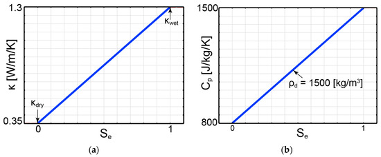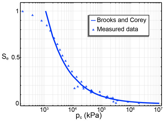 Se: degree of saturation (-) in unsaturated media. Se is often described in the form of soil–water retention models (for example, the van Genuchten model [22] and the Brook and Corey model [23]), in which the relationship between Se and capillary pressure (pc) is defined using data from suction tests. An example of the Brook and Corey water retention model adopted in this paper can be found in Section 4.2.1. Also, it is worth noting that pc is the negative porewater pressure under the assumptions of (1) small and constant air pressure and (2) the absence of osmotic suction [18]. When gas is involved or pore fluid in unsaturated media is filled with salty water, Equation (4) should be modified accordingly.