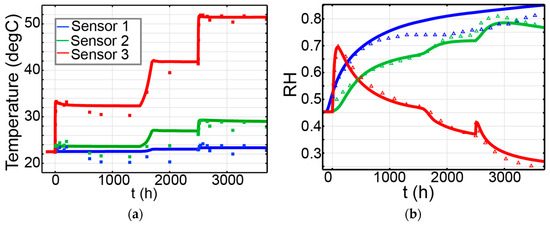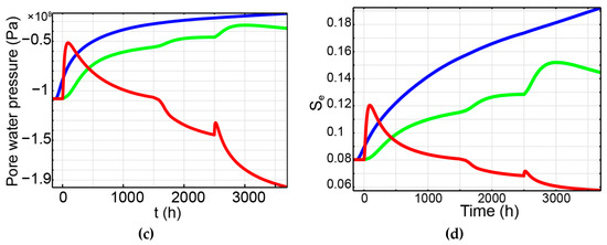 As a result of the heating, the liquid water of soil sample in proximity to the heater is vaporized, which is reflected by a boost in RH (red line in Figure 12b). Still, due to the vapour transport mechanism where the humidity is driven by heat and moves toward the colder region, this RH increase quickly diminishes and gradually declines. The vapour transport mechanism brings water vapour upward, which results in the consistent increase in RH in sensors 2 and 1 (green and blue lines, respectively, in Figure 12b) before reaching an equilibrium value at about 80%. It is worth noting in Figure 12b that there was not a perfect match in RH between the model and readings in sensor 1 (blue line). This is thought to be caused by the disturbance of water leakage into the soil during the initial period of the experiment.