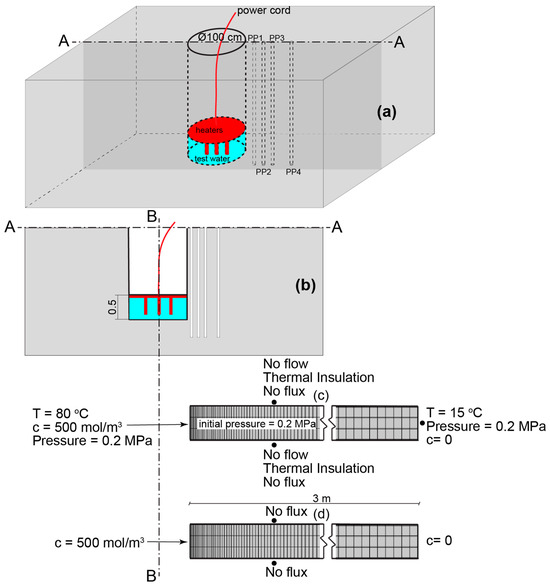 The experiment involves a primary vertical borehole (BH1), which measures 100 cm in diameter and has a depth of 300 cm, drilled into argillaceous sedimentary rock that contains test water and a system of observation boreholes (PP1, PP2, PP3 and PP4 located 10, 20, 30 and 50 cm, respectively, away from BH1). Within this main borehole, there is test water containing specific solutes (e.g., Cl−, Br−, I−) at concentrations of 500, 50 and 50 mol/m3, respectively. These concentrations are chosen to create a sufficiently high chemical gradient to be observed in core samples compared to the background concentrations in the porewater of the clayrock. To maintain a consistent temperature of 80 °C, the water is continuously heated using heaters (Figure 13a).