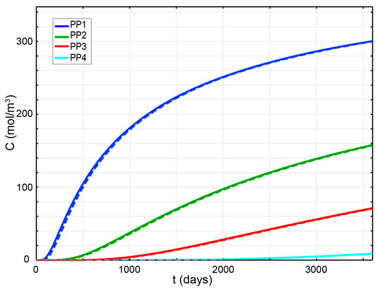 The concentration changes observed at different positions (PP1, PP2, PP3, PP4) for scenarios C1 and C2 are shown in Figure 14 using solid and dashed lines, respectively. For the remainder of this paper, it is established that solid lines denote case C1, whereas the dashed lines depict case C2 in order to facilitate clarity and comprehension.
