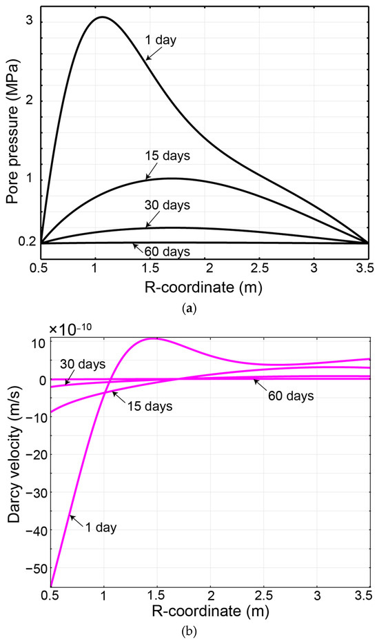 Development of (a) pressure and (b) Darcy’s velocity as a function of radial distance from primary borehole BH1.