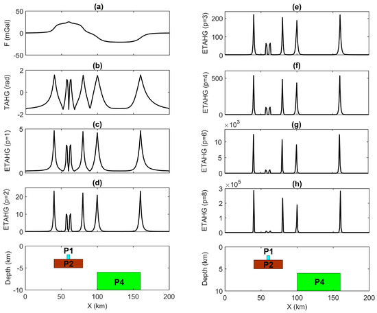 The results of the TAHG and ETAHG from Figure 2 were also compared in a horizontal profile (Figure 1b). Figure 3a shows the gravity anomaly along this profile. Figure 3b–h display the edges determined by the TAHG and ETAHG with p = 1, 2, 3, 4, 6 and 8, respectively. One can note from these figures that the signals over the edges along the ETAHG profiles are sharper than those of the TAHG. However, the amplitude of the transformed signal over the source P1 decreases as the p value increases. The ETAHG produces weak amplitude responses when the p value is greater than or equal to 2. For this reason, we used p = 1 in the subsequent ETAHG calculations.