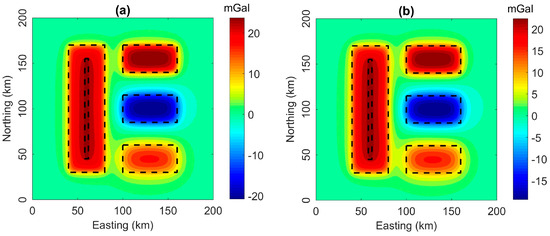 In this section, we estimate the effectiveness of the ETAHG through synthetic gravity examples with and without noise. The synthetic model includes five prisms, as shown in Figure 1a. The parameters of the model are presented in Table 1. Using these parameters, the gravity anomaly of the model is calculated and shown in Figure 1b.