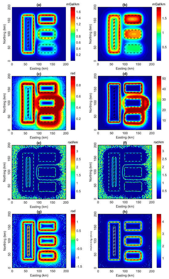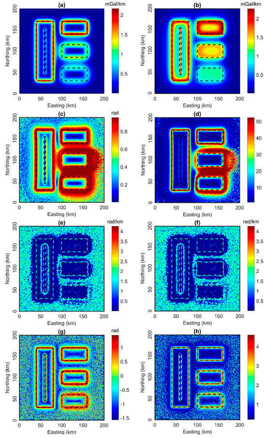 To estimate the sensitivity of the ETAHG to random noise, we consider the second example where gravity data in Figure 2b was corrupted with 3% Gaussian noise (Figure 4a). Figure 5a–h display the edges delineated by applying the HG, AS, TM, ETM, HGNTilt, HGimpTDX, TAHG and ETAHG to gravity data in Figure 4a, respectively. As can be observed from these figures, the HG and AS are less sensitive to noise than others. However, these methods are dominated by the bodies P2 and P3. The TM, ETM, HGNTilt, HGimpTDX, TAHG and ETAHG are less sensitive to the depth of the bodies. As the HGNTilt and HGimpTDX are based on the third derivatives and/or fourth derivatives, they are more sensitive to noise than the TM, ETM, TAHG and ETAHG. In this case, the ETAHG still shows the edges more clearly than other methods.