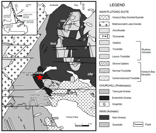 Geology of the Voisey’s Bay area showing the location of the Voisey’s Bay Ni-Cu-Co deposit (red star) (adapted from [50,51]).