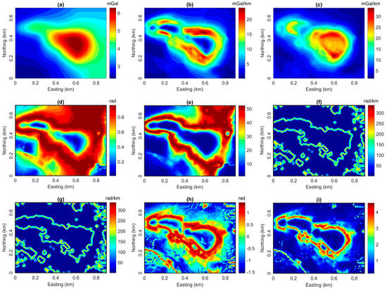 (a) Bouguer data of the Voisey’s Bay Ni–Cu–Co deposit. (b) HG. (c) AS. (d) TM. (e) ETM with p = 4. (f) HGNTilt. (g) HGimpTDX. (h) TAHG. (i) ETAHG with p = 1.