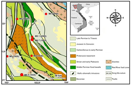 The Tuan Giao area is located between the South China block and the Sundaland block. It is considered as a part of the transition boundary zone between these two blocks [54]. Two main factors, the (i) collision of the Indo-Australian and Eurasian plates and (ii) subduction of the Pacific plate under Eurasian plate, explain that the Tuan Giao area has high dynamic activities. The Tuan Giao is a mountainous area with a complicated geological structure (Figure 9), dominated by many active faults, such as the Dien Bien Phu fault, Son La fault, Song Da fault and Song Ma fault [55,56,57]. From the works of many researchers, young materials (i.e., magmatic rocks) intruded into old sedimentary rocks environment through the faults (Figure 9) [55,56]. For this area, Permian–Triassic sediment rocks dominate the most area while the rest as thin stripes disseminate along faults. In this area, there were at least seven earthquakes, with a magnitude of above five occurring from 1914 to 1983. These earthquakes are shown in Figure 5. The two biggest earthquakes occurred at Dien Bien in 1935 (M 6.8) and Tuan Giao in 1983 (M 6.7) (Figure 9). Both earthquakes severely damaged homes and infrastructure and killed or injured dozens of people in landslides [54]. Since then, no earthquakes with a magnitude of 5 have occurred in the study area; thus, this is a high-risk area for earthquakes. Therefore, accurately determining the location of faults in high-risk earthquake areas is necessary to have accurate earthquake hazard assessments and earthquake forecasts in the area.
