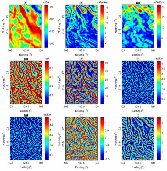 (a) Bouguer data of the Tuan Giao. (b) HG. (c) AS. (d) TM. (e) ETM with p = 4. (f) HGNTilt. (g) HGimpTDX. (h) TAHG. (i) ETAHG with p = 1.