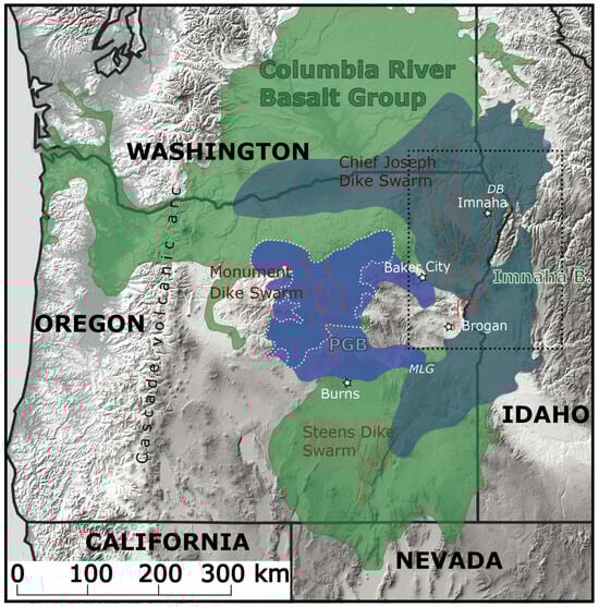 Extent of the Imnaha Basalt and Picture Gorge Basalt within the Columbia River Basalt Group of the Pacific NW, USA. Blue for PGB is the extended distribution of [24]; dashed white line is for original distribution. Distribution of CRBG, original PGB, and Imnaha Basalt taken from [1]; DB = Dug Bar, MLG = Malheur Gorge. Dashed black rectangle indicates coverage of Figure 4.