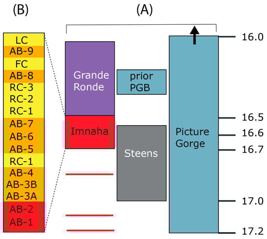 (A) Age and stratigraphic relationships of main phase CRBG formations of Imnaha, Grande Ronde, Steens, and Picture Gorge Basalt. Younger (Wanapum, Saddle Mountains) and minor (Prineville) formations are not shown. Ages from [2,12,24,25]; red line for ages of AB1&2 flows of this study; ‘prior PGB’ = stratigraphic position prior to [2], upward arrow on PGB to indicate youngest age of 15.75 Ma [24] (see text for discussion). (B) Flow stratigraphy of Imnaha Basalt after [26]; AB = American Bar, RC = Rock Creek, FC = Fall Creek, and LC = Log Creek subunits.