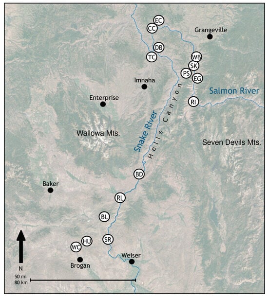 Sampling for this study was carried out in two areas, the northern one encompassing the greater Hells Canyon area located north of the Wallowa–Seven Devils Mountains divide (Figure 4). The northern area has historically received the most attention for investigating Imnaha Basalt and is the basis for establishing the existing stratigraphy and chemical types of the Imnaha Basalt [26]. The second area includes a wide swath from just south of the Wallowa–Seven Devils Mts divide (Figure 4) towards the town of Huntington and the town of Brogan. Lavas of Imnaha Basalt have been reported from this area e.g. [44], and this area constitutes the southeastern-most extent of the Imnaha Basalt (Figure 1). In both areas, lavas of Imnaha Basalt directly overlie rocks of Paleozoic terranes or Cretaceous plutonic (mostly granodioritic) rocks.
