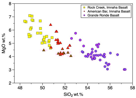 MgO vs. SiO2 plot displaying data from the American Bar and Rock Creek flows of the Imnaha Basalt and the Grande Ronde Basalt. Data from [16].