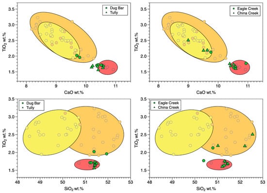 All seven samples were selected for bulk rock analysis. These samples have SiO2 values that range from 51.2 to 51.9. The five samples from the stratigraphically lowest flows are nearly indistinguishable, while the two uppermost are compositionally distinct (Figure 6, S2, S3 Supplemental Material). For example, the elemental range of these five for TiO2, CaO, La, and Zr are, respectively: 1.68–1.72 wt.%, 10.36–10.58 wt.%, 9.9–10.2 ppm, and 118 to 121 ppm. The values for the same elements for the stratigraphically highest two samples are: 1.96–2.02 wt.%, 9.68–9.79 wt.%, 15.2–16.8 ppm, and 168–172 ppm. All samples possess Mg numbers of 46, with the exception of the two stratigraphically highest samples with values of 40 and 43. The five lower samples all fall within the envelope representing the spread of samples classified as American Bar 1 and 2 by [26], while the higher pair plot in diagnostic major element space (TiO2 vs. SiO2 or TiO2 vs. CaO) into the American Bar 3+ field (Figure 6). The silica values for all of the Dug Bar samples reported are too high to represent Rock Creek flows [26].
