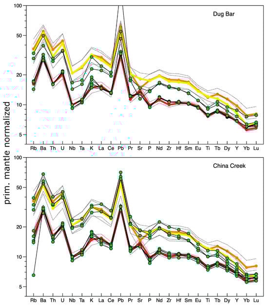 Primitive mantle-normalized incompatible elemental diagrams (normalization values taken from [48] of average AB1&2 (red), AB3+ (orange), and RC (yellow) compositions of data by [16] with 1 sigma envelopes (dashed lines) and samples of our study (green circles) from two sites, illustrating how normalized incompatible elemental diagrams were used to assign our samples a flow identity of either AB1&2, AB3+, or RC (see text).
