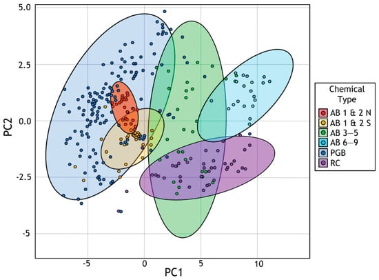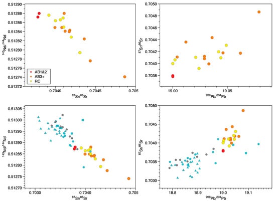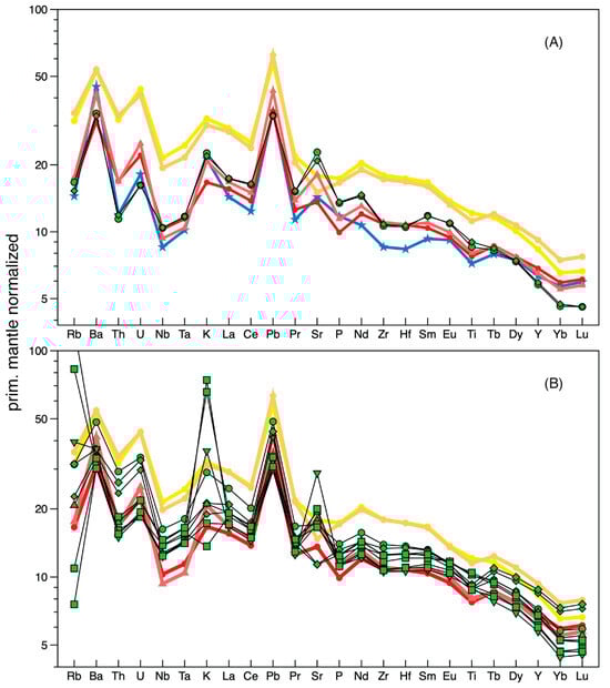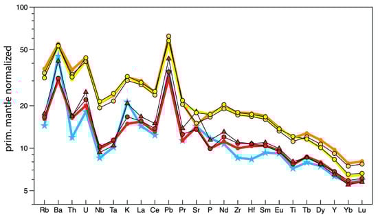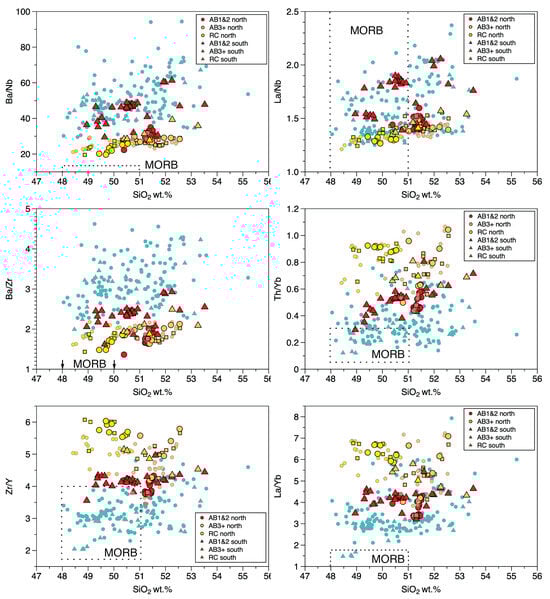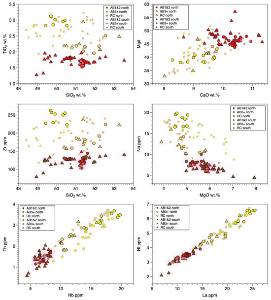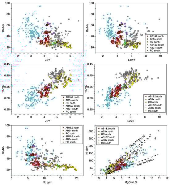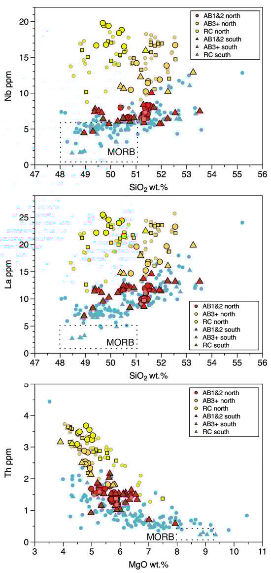 Primitive mantle-normalized incompatible element diagram comparing composition averages of AB1&2 (red), AB3+ (orange), and RC (yellow) flow data of [16] with averages for data of this study (black lines) and distinguishing averages for AB1&2 from the northern area (red circles) and southern area (red triangles). Average PGB composition shown in blue using data of [2,16,24].
