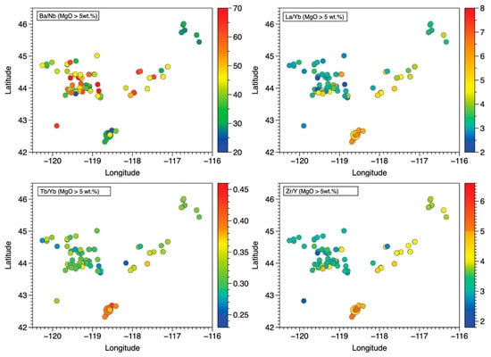 - Moore, N.E.; Grunder, A.L.; Bohrson, W.A.; Carlson, R.W.; Bindeman, I.N. Changing mantle sources and the effects of crustal passage on the Steens Basalt, SE Oregon; chemical and isotopic constraints. Geochem. Geophys. Geosystems 2020, 21, e2020GC008910. [Google Scholar] [CrossRef]