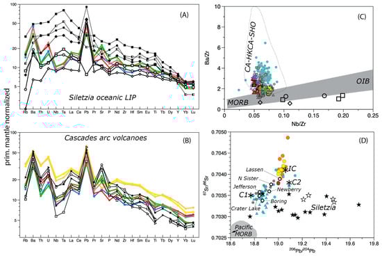 - Schmidt, M.E.; Grunder, A.L.; Rowe, M.C. Segmentation of the Cascade Arc as indicated by Sr and Nd isotopic variation among diverse primitive basalts. Earth Planet Sci. Ltr. 2008, 266, 166–181. [Google Scholar] [CrossRef]