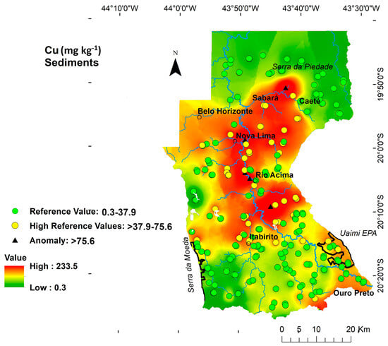 The distribution of Cu in the basin (Figure 5) presented levels of up to 37.9 mg kg−1 in 76% of the area. Considering that the HRV is 37. 9 to 75.6 mg kg−1, 41 drainage segments are within this range, of which nine points are located in rural communities and environmental preservation areas (EPA) draining on the quartz–carbonates schists of the Córrego do Sítio and Catarina Mendes Units. Thus, weathering allied to the erosive processes can release elements to the sediments in important concentrations even in low-anthropogenic interference.